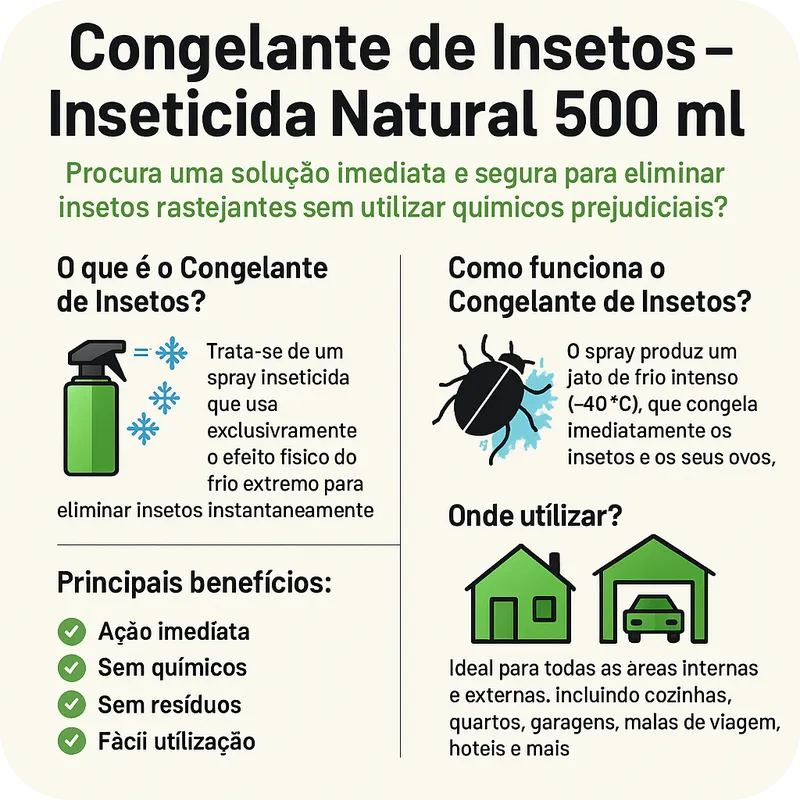 O Congelante de Insetos KO Green Spray é um inseticida natural que elimina percevejos, baratas, formigas e outros insetos rastejantes de forma imediata e segura, sem químicos. Atua por frio extremo (-40 °C), congelando o inseto no momento — ideal para usar em casa, hotéis, malas de viagem e zonas sensíveis.