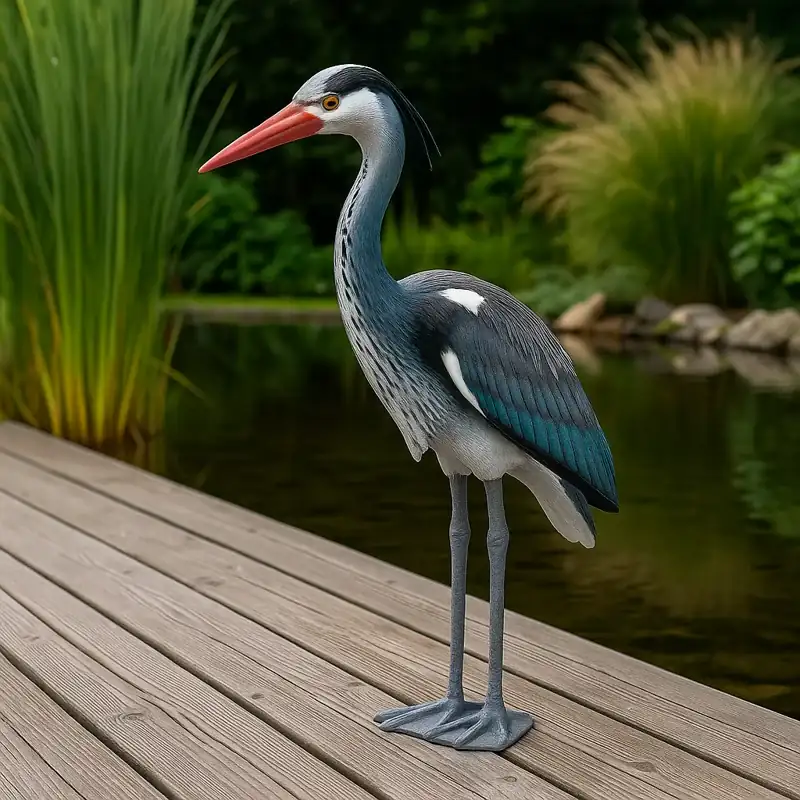 A garça decorativa é amplamente utilizada em jardins privados, zonas comerciais, parques, lagos artificiais e áreas públicas onde a presença contínua de aves cria problemas de sujidade ou risco de contaminação. O design leve e resistente permite ajustá-la facilmente conforme as necessidades do espaço.