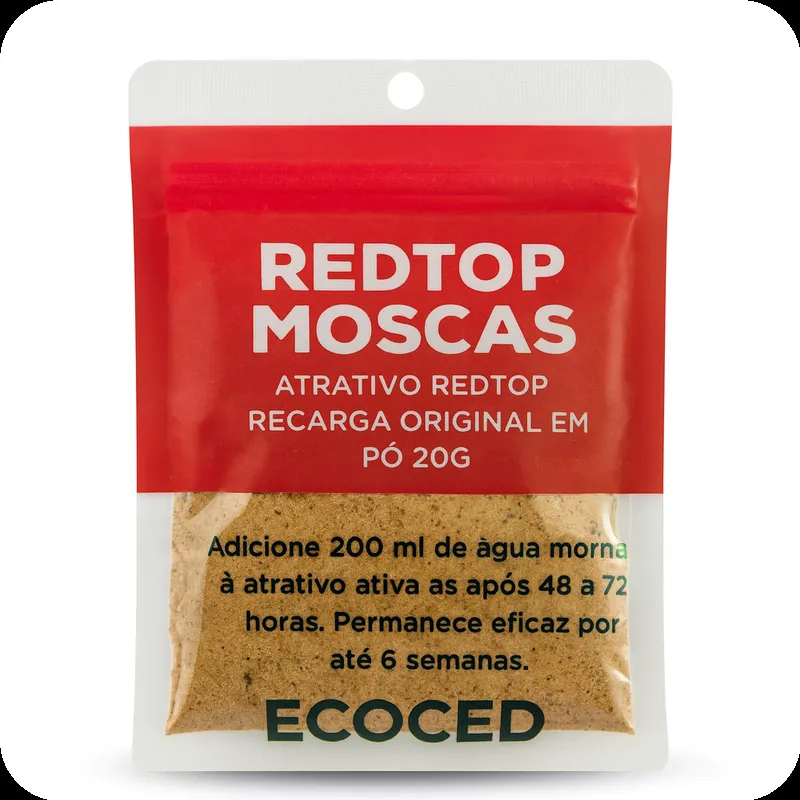 • Descrição: Atrativo em pó Redtop para atrair moscas sem químicos. Ativa-se com água morna e dura até 6 semanas.